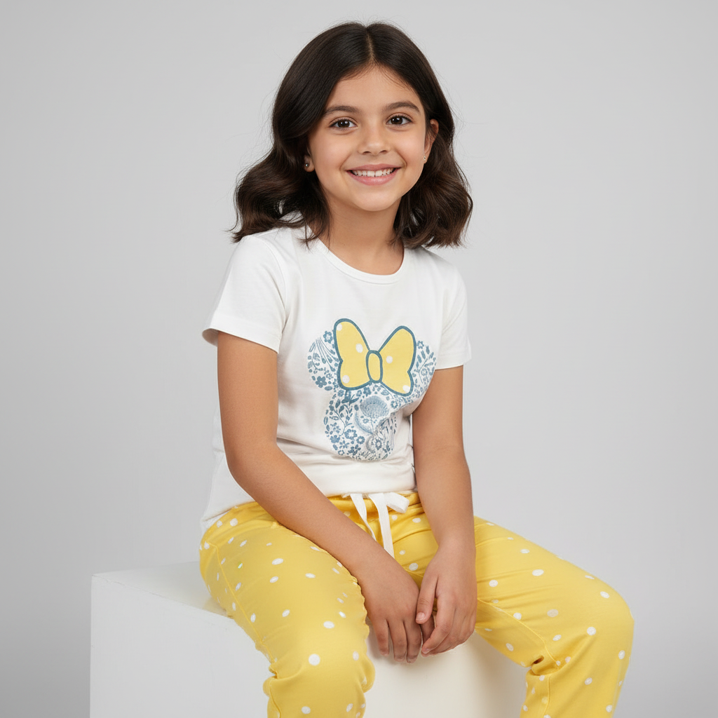 The Brightside Pajama Set is crafted in soft, breathable cotton designed for easy comfort and cheerful nights. Featuring a playful graphic tee paired with sunny yellow polka dot pants, this set brings instant joy to bedtime routines.
