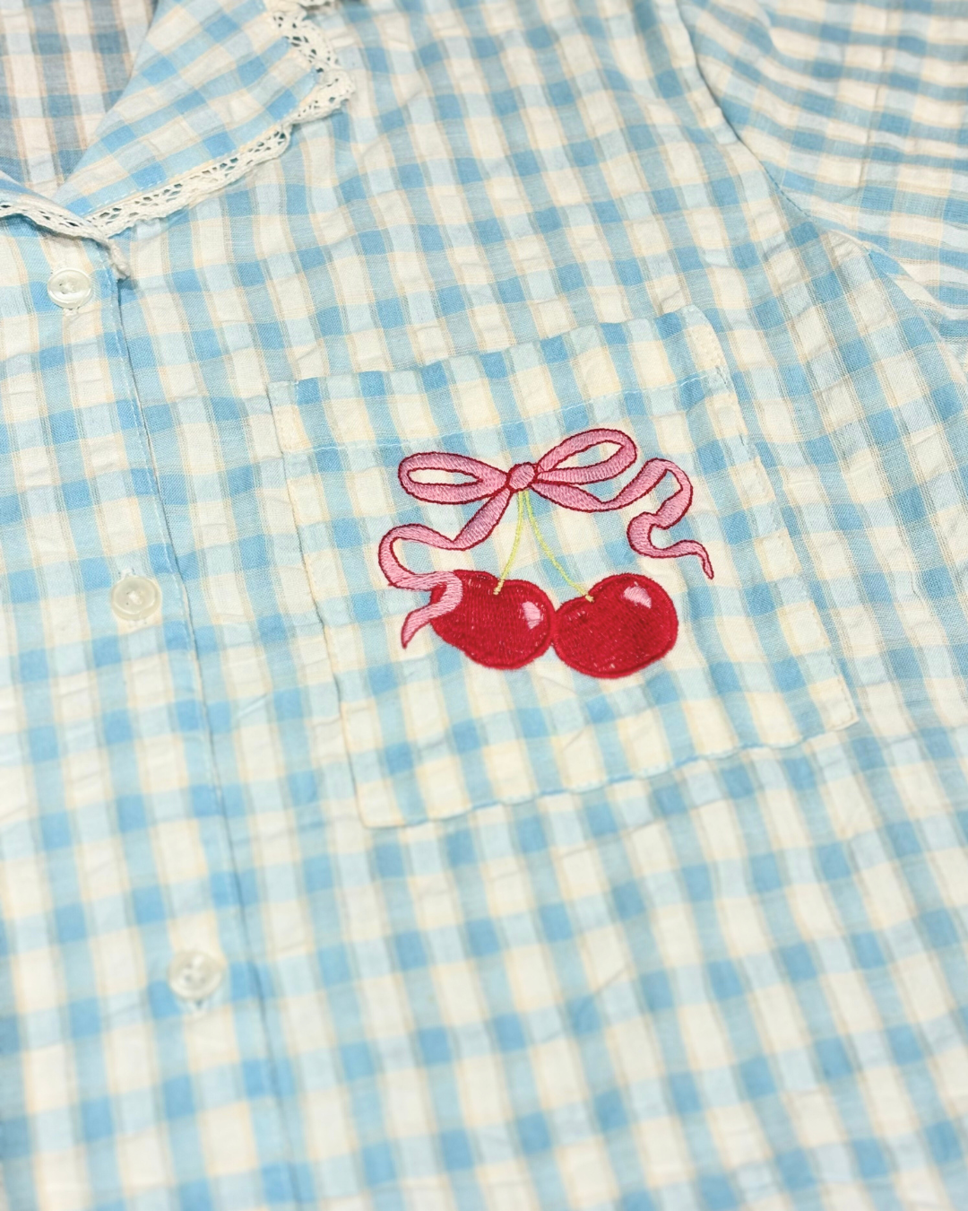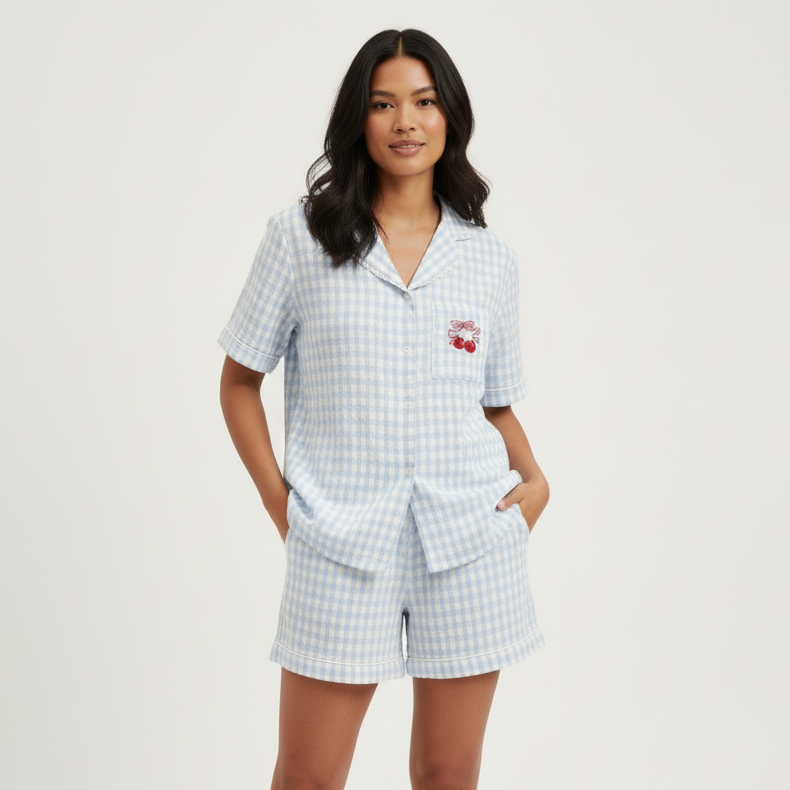 Our Cherry On Top Nightsuit is crafted in ultra-soft cotton seersucker with a powder blue gingham print that feels as good as it looks. The relaxed short-sleeve shirt and matching shorts make it your go-to for lounging, lazy mornings, and everything in between. Featuring a playful cherry embroidery on the pocket for that extra dose of charm — because bedtime deserves a little fun too.