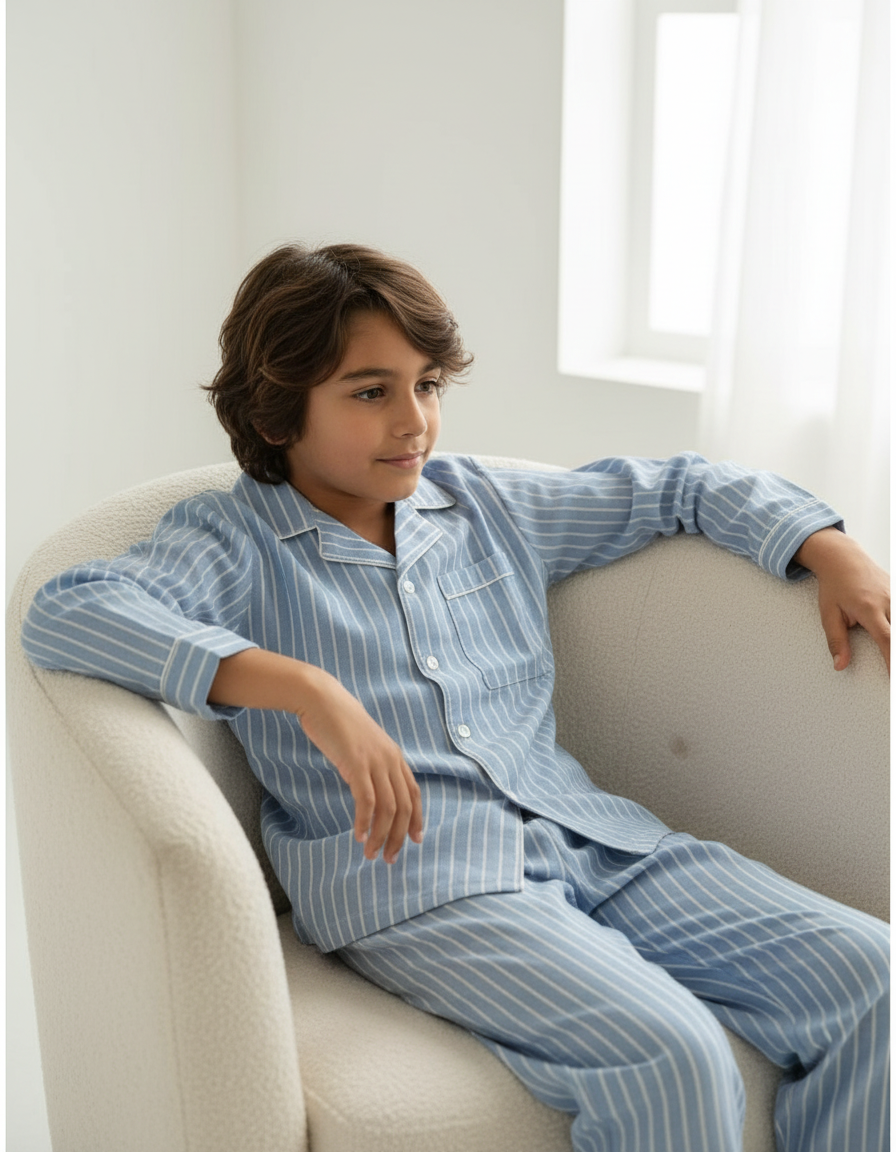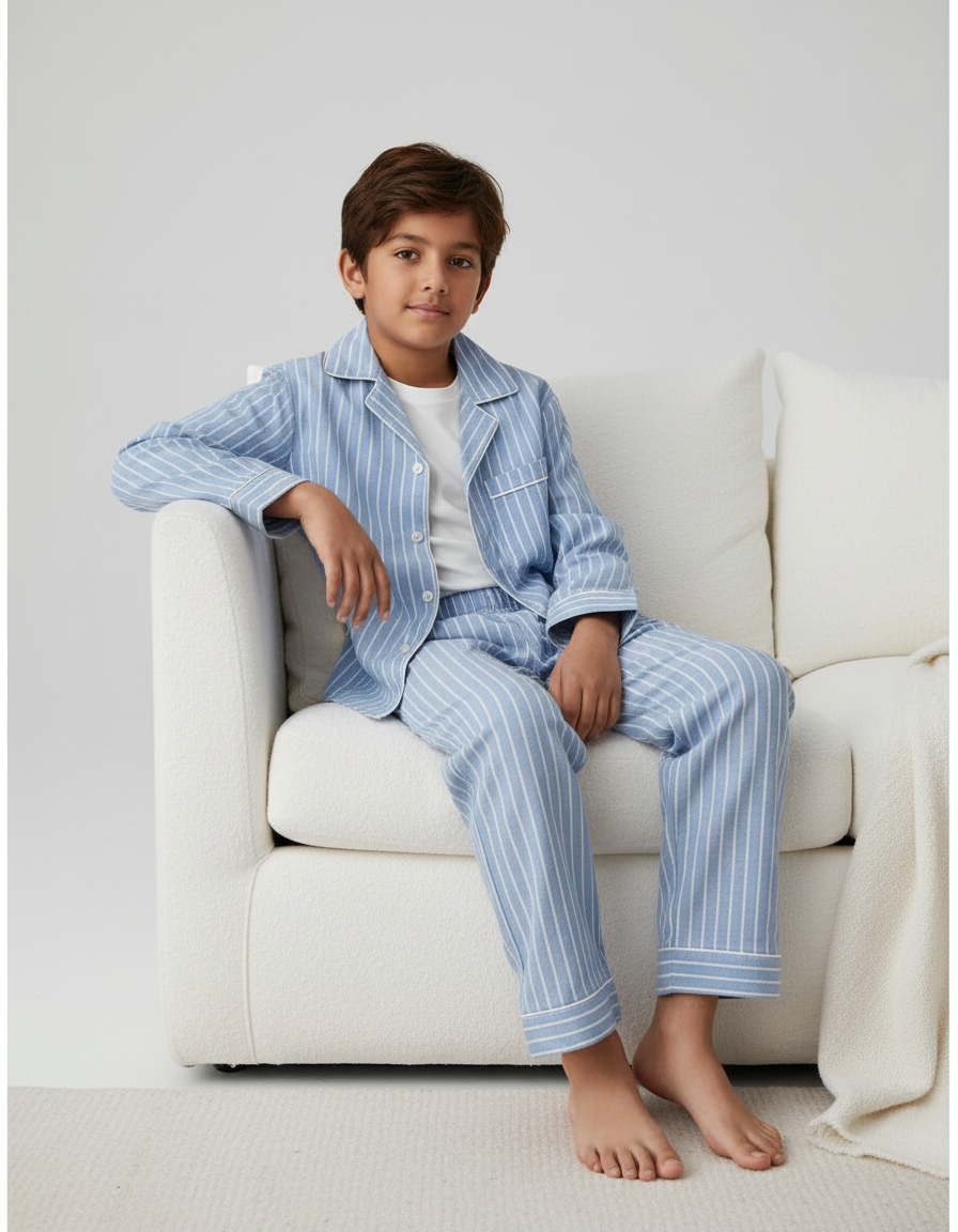 The Coastal set is crafted from soft, breathable cotton designed to keep your little one comfy all night long. Featuring timeless blue pinstripes and a classic button-down silhouette, this set brings grown-up style to bedtime — without compromising on comfort.
