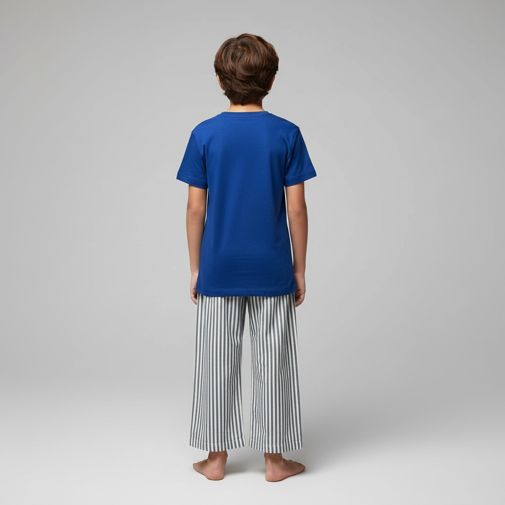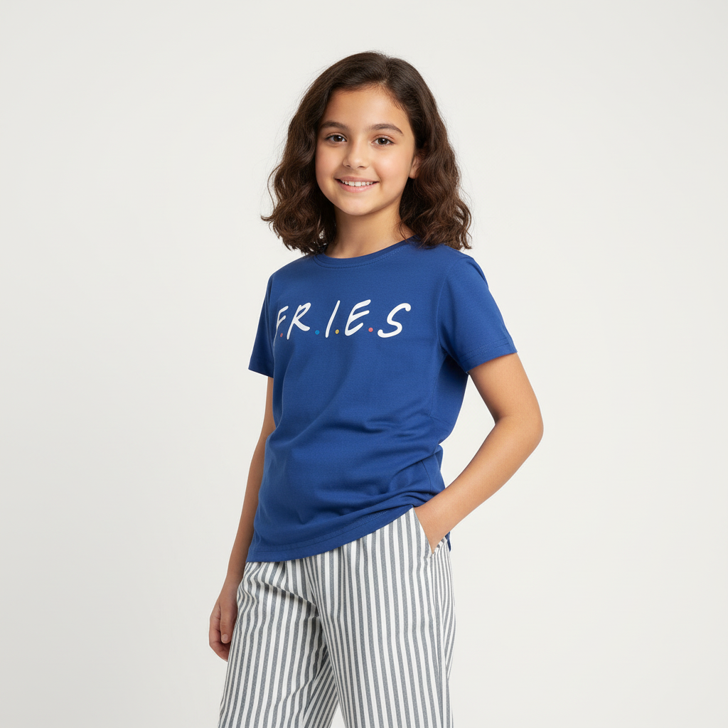 The F.R.I.E.S Pajama Set crafted in soft, breathable cotton. Featuring a cool navy graphic tee and classic striped pajama pants, this set blends playful personality with everyday comfort.