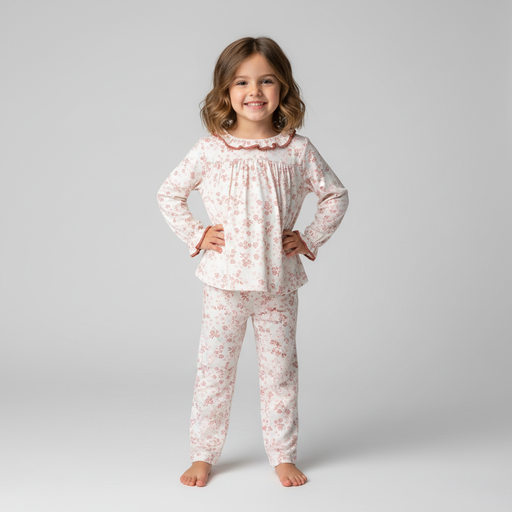 Our Gardenia Kids Nightsuit is crafted in ultra-soft, breathable cotton with a delicate pastel floral print that feels as gentle as a warm hug. The long-sleeve top features a sweet ruffled neckline and cuffed sleeves for a charming vintage touch, paired with matching full-length bottoms designed for easy, all-night comfort. Perfect for bedtime giggles, storybook snuggles, and cozy weekend mornings — because even little dreamers deserve something special.