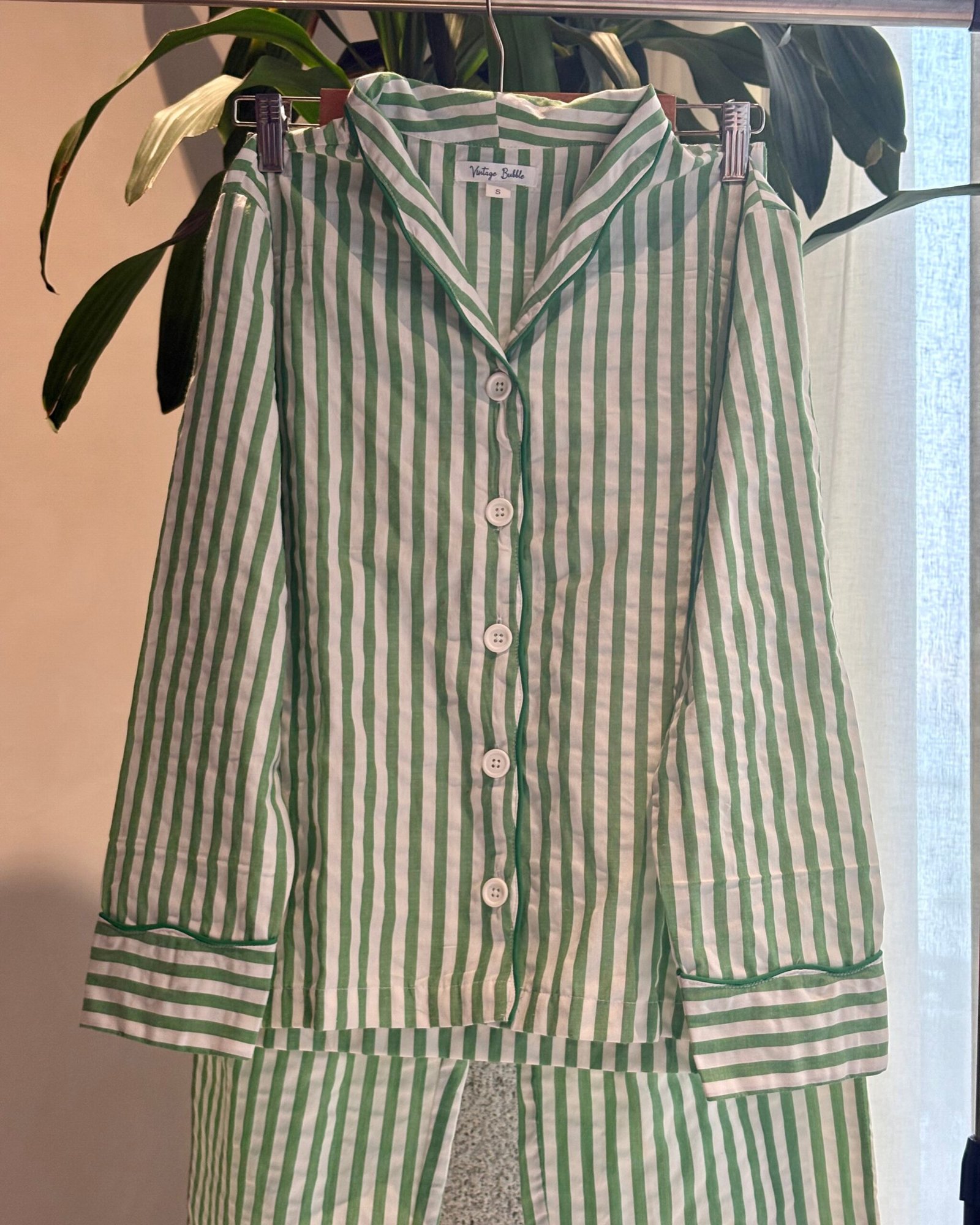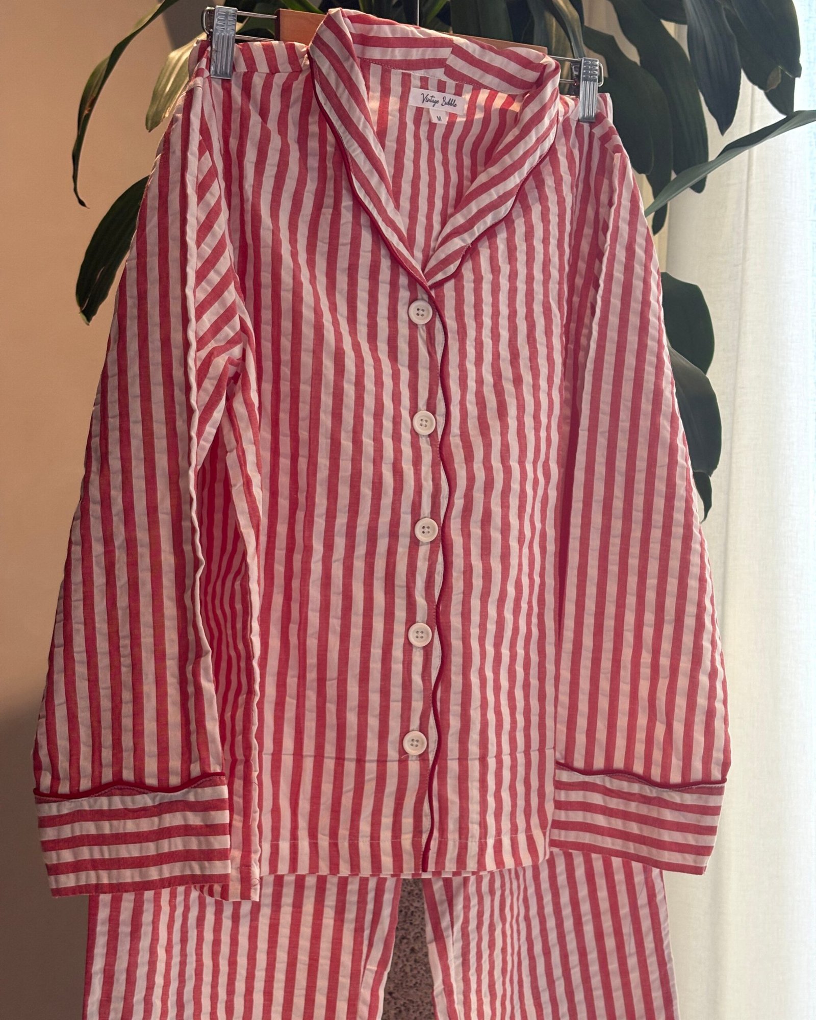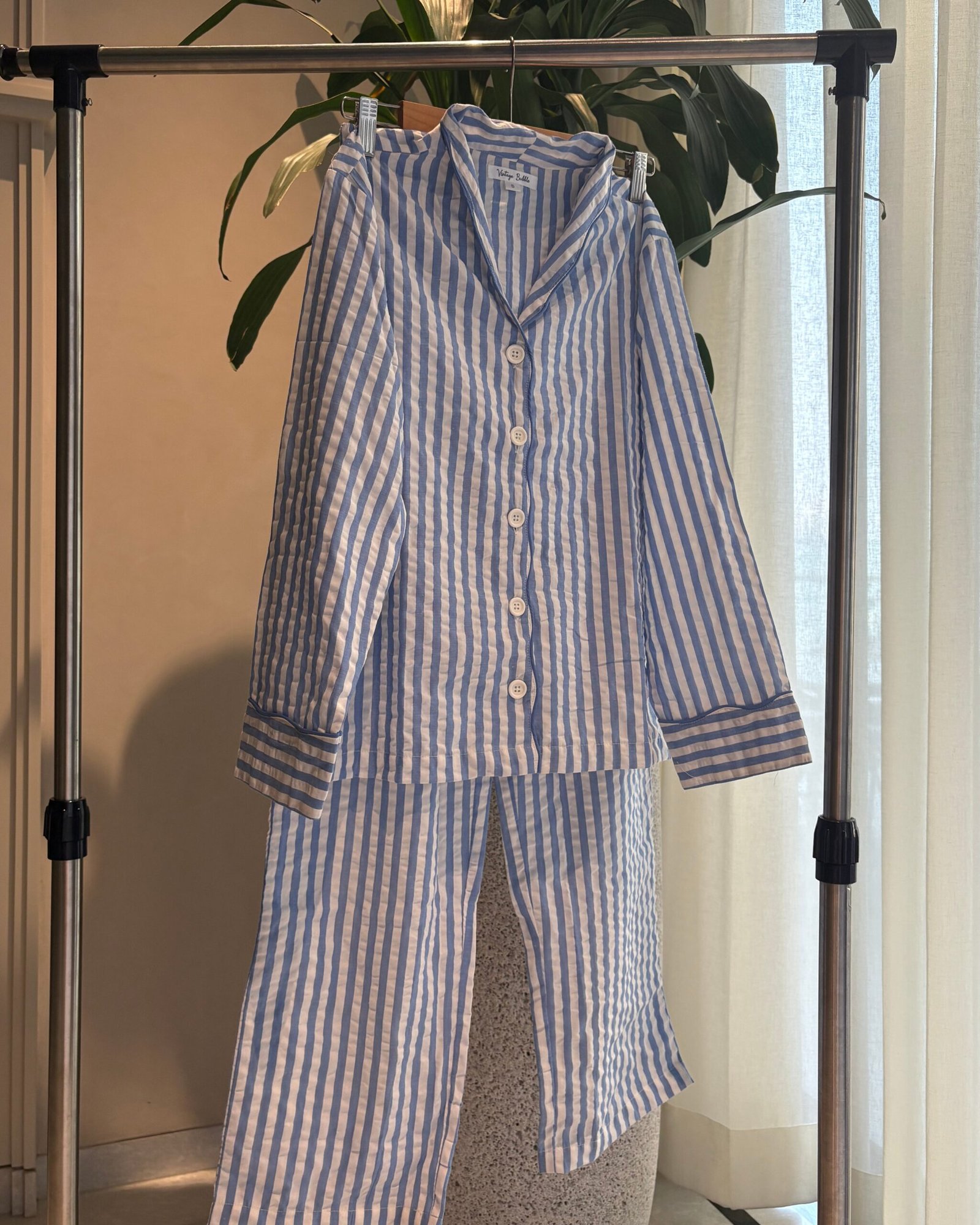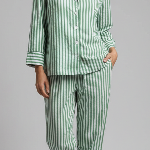 The Sweet Magnolia Nightsuit is designed for dreamy mornings and slow, peaceful evenings. Crafted from airy cotton seersucker, this set feels feather-light on the skin and keeps you cool through warm nights. Featuring a relaxed button-down shirt and matching pajamas with subtle piping, it blends timeless elegance with everyday ease. The soft pastel palette in red, green and blue bring a fresh, feminine charm — perfect for lounging, unwinding, or stepping out for an early coffee run.