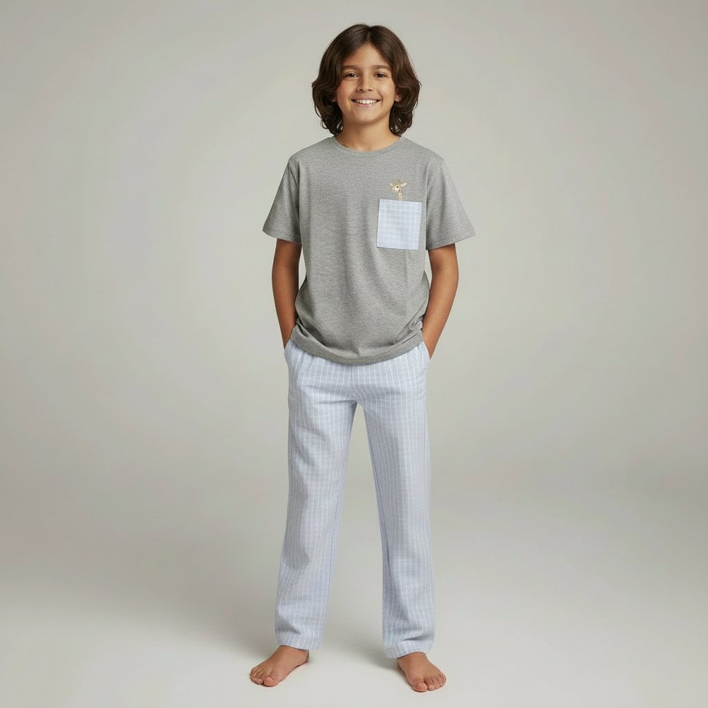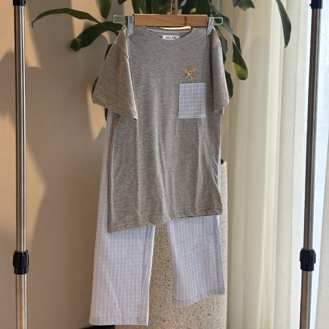The Peekaboo set is all about the small details. The soft light grey tee paired with classic fine grid checks pocket, finished with a tiny giraffe peeking out just where you least expect it.