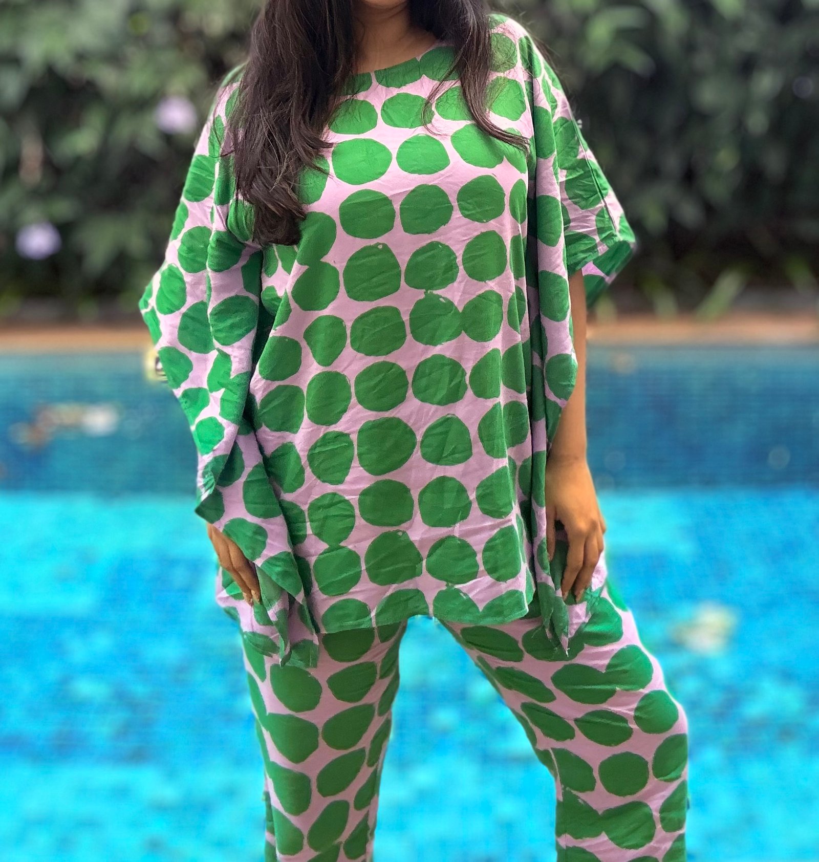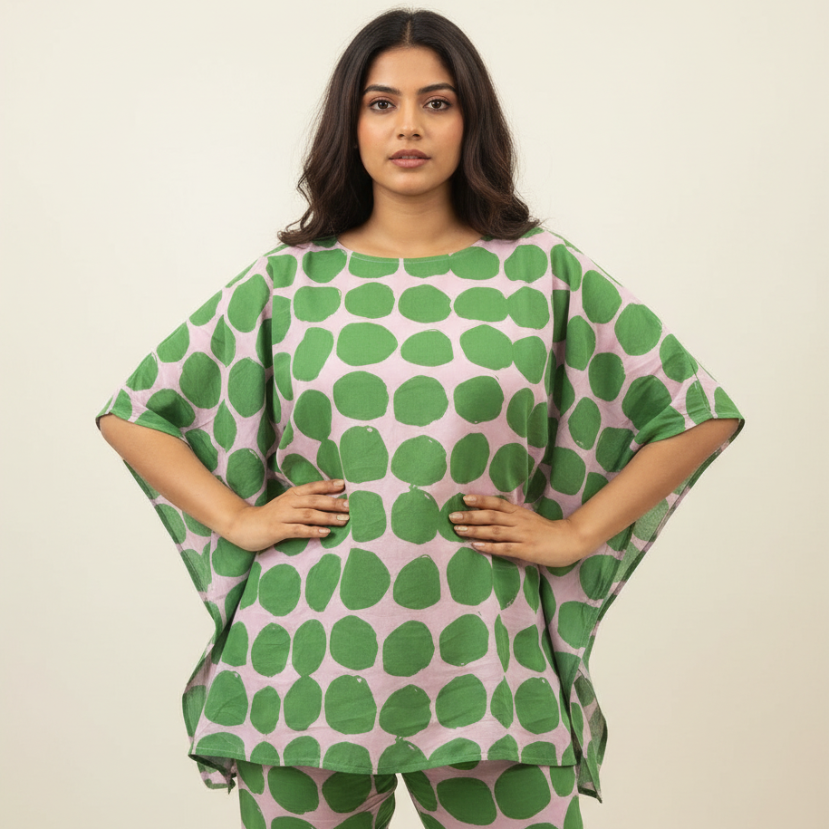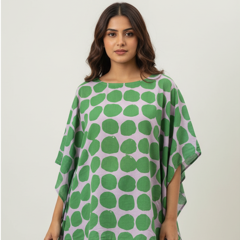 Our Poppy Kaftan Set is crafted in soft, breathable cotton with a soft muted purple base and oversized green poppy-inspired dots that instantly lift the mood. The relaxed, kaftan-style top drapes effortlessly, giving you that easy, breezy silhouette that feels as good as it looks. Paired with matching comfortable pants, this set is perfect for slow mornings, all-day lounging, small errands and of course, bedtime!