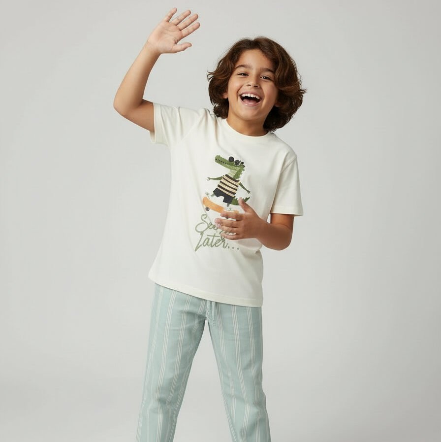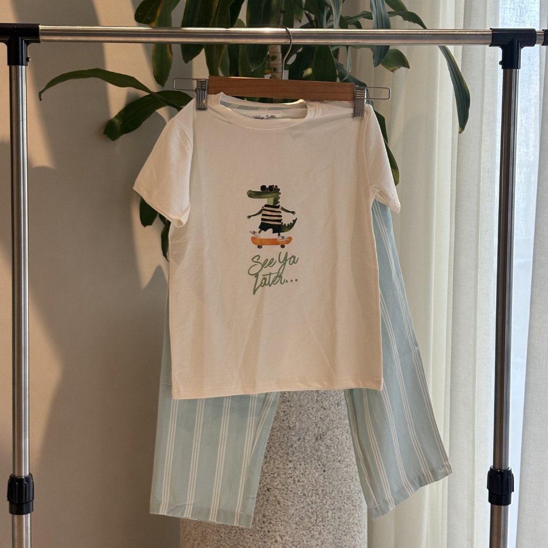 This set is made for those in-between moments. The relaxed tee with its fun graphic pairs effortlessly with soft striped pants, creating a set that feels light, comfortable, and easy to wear.