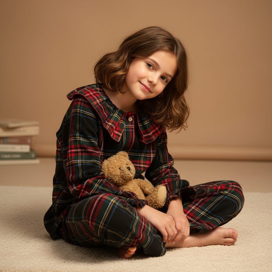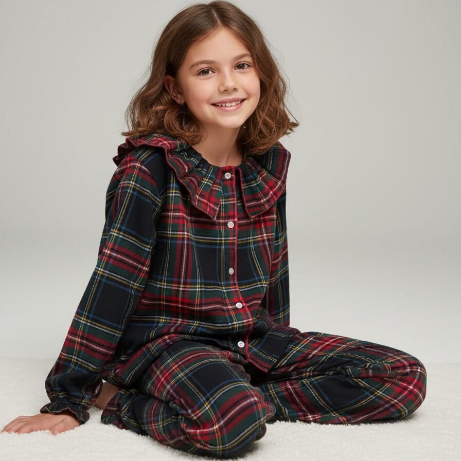 Our Sleigh the Night Kids Nightsuit is made from ultra-soft breathable cotton in a cheerful Christmas plaid that feels gentle on young skin. The comfy full-sleeve top and easy pull-on pants are designed for bedtime stories, present-opening mornings, and all the magical moments in between. Finished with adorable ruffle detailing for that extra holiday cuteness — because little traditions deserve big comfort.