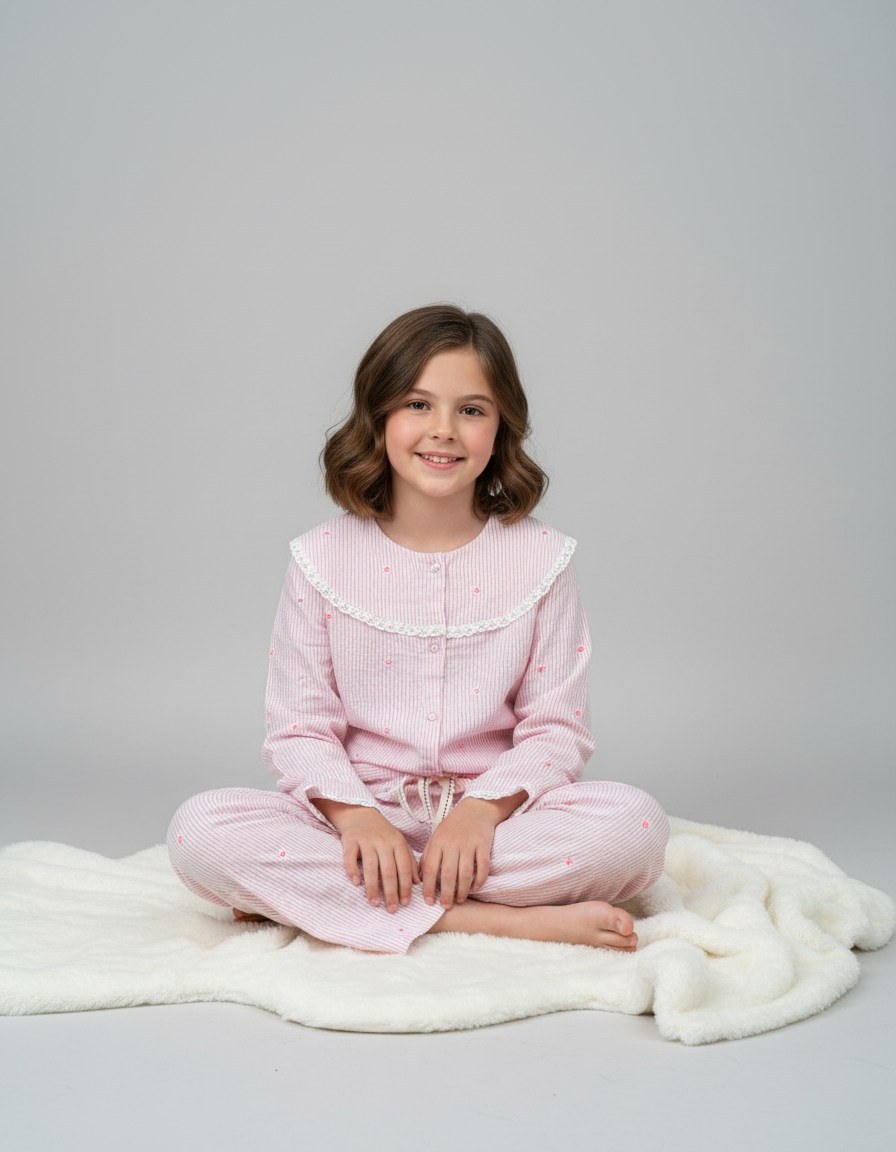 Classic pink stripes get a feminine twist with tiny scattered florals and sweet ruffle trim on this charming button-up top. Complete with matching pants, this set is a traditional pajama style with a touch of whimsical charm.